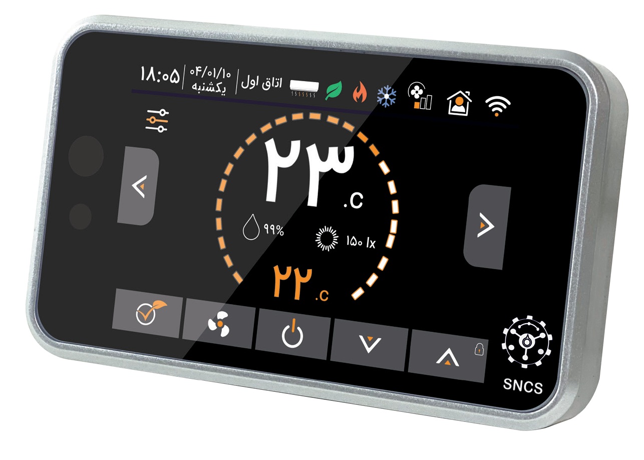 این محصول کاملا بومی بوده و جهت پایش، برنامه ریزی و کنترل فن کوئل با هدف کاهش مصرف انرژی ساختمان توسعه یافته است. ترموستاتهای هوشمند شرکت مجهز به سنسورهای ثبت تردد، شدت نور، دما و رطوبت می باشند. این ترموستاتها مجهز به قابلیت تایمر سنسور حرکت می باشند به گونه ای که در صورت عدم ثبت تردد پس از یک زمان قابل تنظیم در ترموستات، ترموستات اقدام به خاموش نمودن فن کوئل می نماید و به محض ثبت تردد، اقدام به راه اندازی فن کوئل در حالت کاری، سرعت و دمای که قبلا توسط کاربر تنظیم شده است می نماید. ترموستاتهای هوشمند شرکت همچنین مجهز به قابلیت زمان - دما و روزهای کاری می باشند و به این ترتیب قابل برنامه ریزی می باشند. ترموستاتهای هوشمند شرکت دارای رابط کاربری فارسی بوده و تاچ اسکرین می باشند. این ترموستاتها به 3 صورت استند الون، تحت وب سرویس و تحت وب قابل استفاده می باشند. در حالت تحت وب سرویس نیاز به تهیه گیت وی شرکت علاوه بر ترموستاتها می باشد. گیت وی های شرکت مجهز به یک برنامه کاربر دوست وب سرویس می باشند به گونه ای که کاربر از طریق اتصال به شبکه داخلی می تواند از طریق آن اقدام به پایش و کنترل ترموستاتهای هوشمند از راه دور نماید. در حالت تحت وب، ترموستاتهای هوشمند از طریق گیت وی به نرم افزار تحت وب مدیریت بهینه و هوشمند ساختمان شرکت متصل شده و بنابراین از طریق آن کاربر مجاز از هر نقطه از کشور می تواند علاوه بر پایش و کنترل محلی، اقدام به پایش، برنامه ریزی و مدیریت هوشمند و کنترل ترموستاتها نماید.